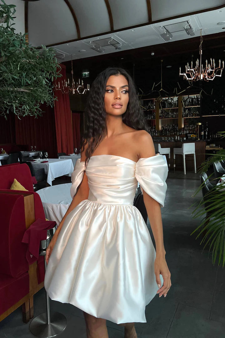 The Aurelia Bodice Puffy Skirt Mini Dress is a luxurious pearl satin mini crafted to bring airy elegance and romantic charm to your wardrobe.