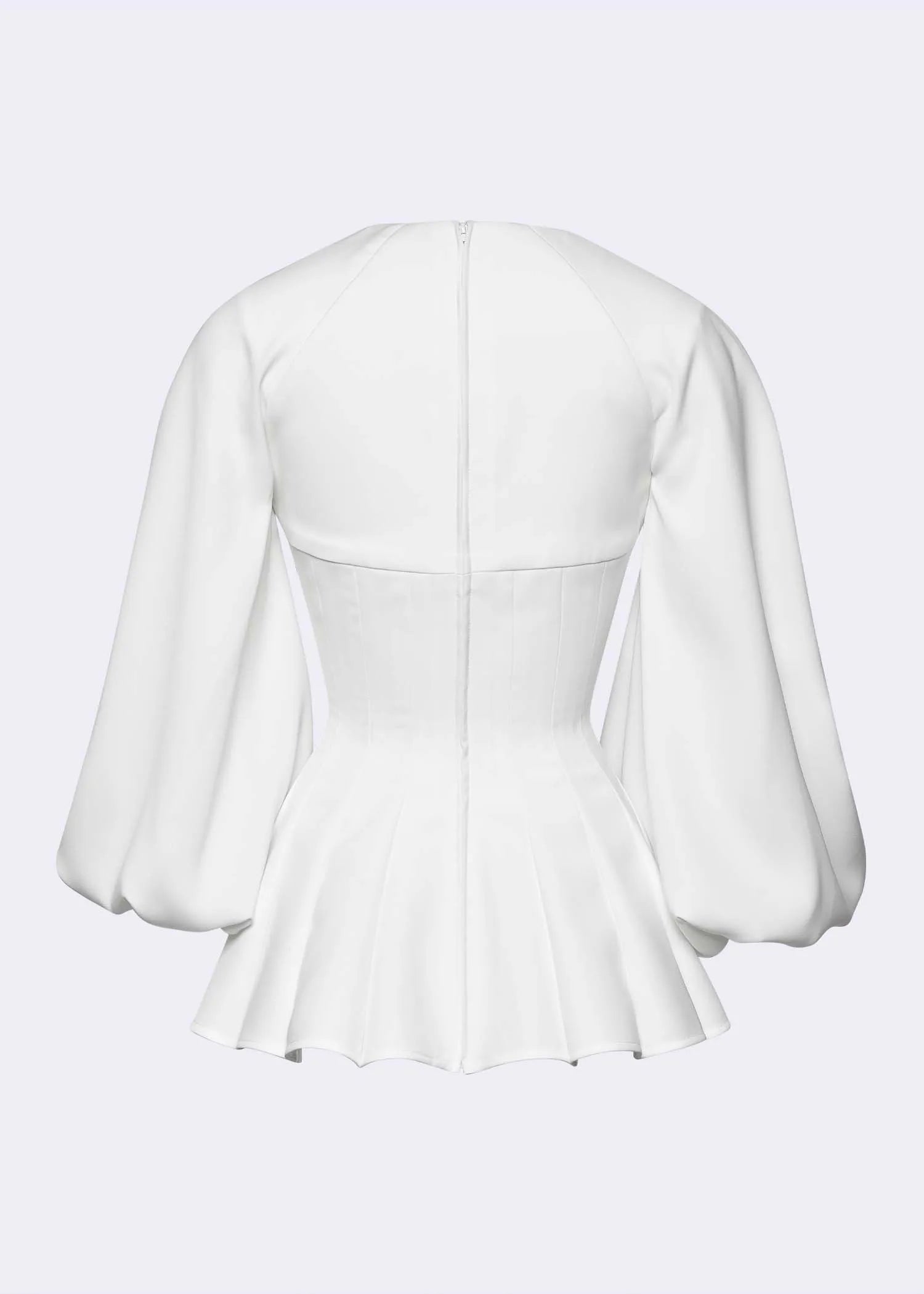 The Balloon Sleeve Peplum Flare Top. This sophisticated white blouse blends timeless femininity with modern structure, creating a silhouette that is both polished and effortlessly elegant.
