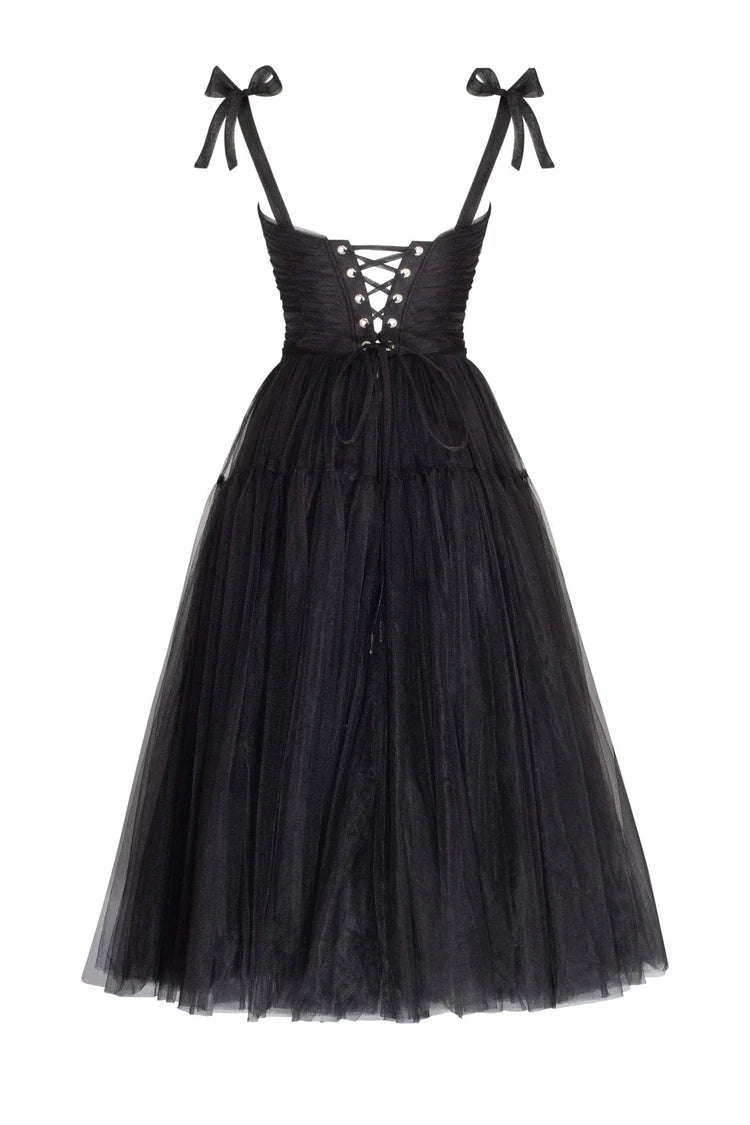The Black Bloom Lace Up Tulle Dress is a charming blend of playful romance and classic femininity. Crafted from soft, weightless black tulle, this off the shoulder cocktail midi gown brings a fresh, youthful elegance to any special occasion.