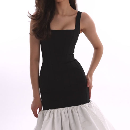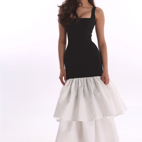 Make an unforgettable impression in this modern yet romantic Black Contour maxi dress with Ivory Puffy Tiered Skirt, Parisienne. The sleek, fitted bodice is crafted with a square neckline and wide straps, creating a clean, sculpted silhouette that flatters from every angle.