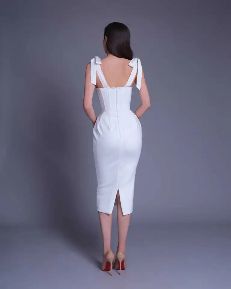 The Bustier Sheath With Grosgrain Ribbon Dress. This refined off white sheath dress blends modern sophistication with soft romantic detailing for a polished evening look.