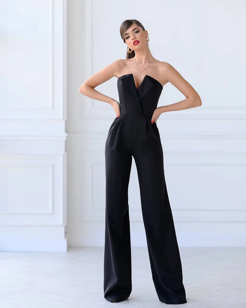 The flattering V-neckline and wide leg silhouette create a sleek, elongated look, making it perfect for both professional and evening wear.