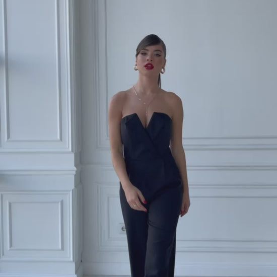 The Classic Black V-Neck Sleeveless Jumpsuit is a timeless wardrobe essential, combining sharp tailoring with effortless elegance. Crafted from premium suit crepe with a subtle diagonal texture, it offers a structured yet comfortable fit.