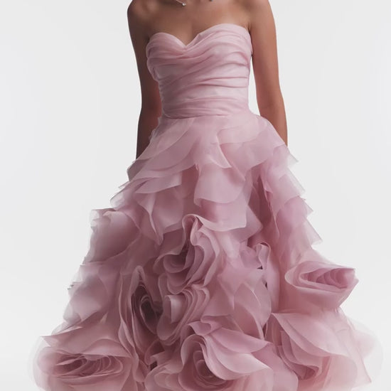 The Dramatic Floral Organza Midi Dress in Misty Rosalia is a breathtaking blend of couture artistry and romantic elegance. Crafted from luxurious misty rose organza, this statement cocktail silhouette features a draped, fitted bodice that sculpts the waist beautifully while maintaining a soft, ethereal flow.