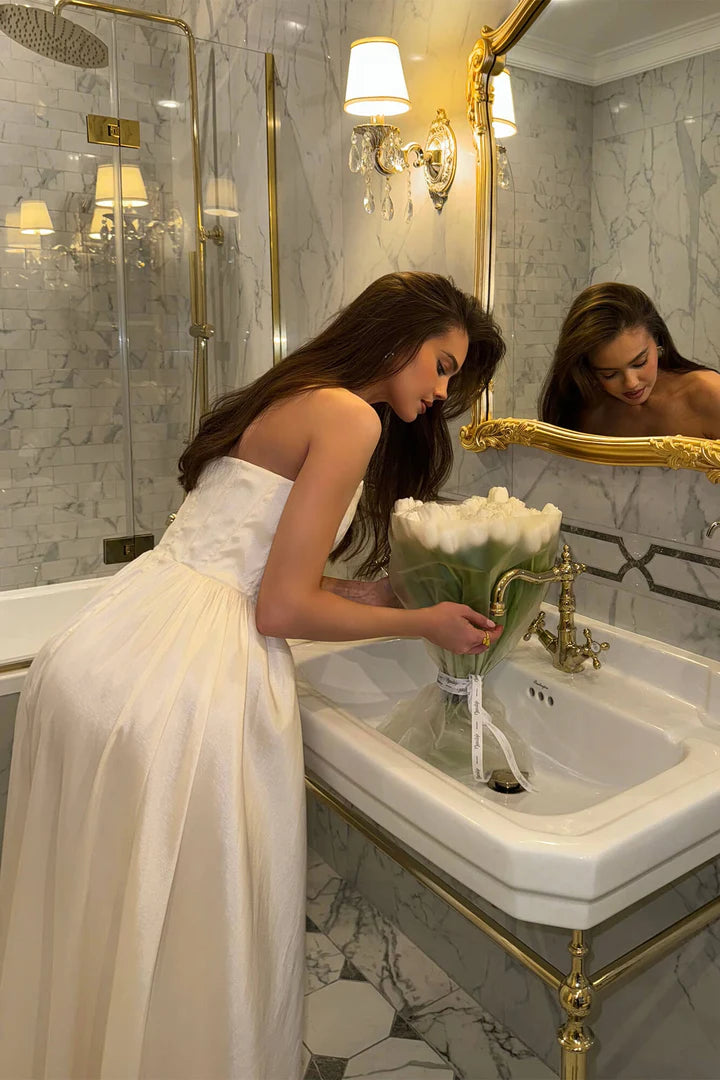 This Bustier Midi Dress with a Figured Corset in Ivory is a timeless expression of femininity and structure.