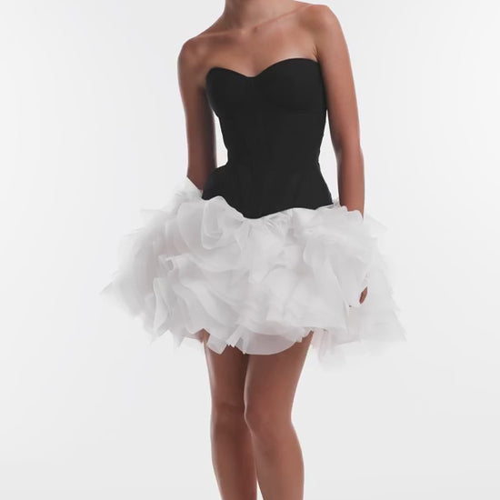 Its puffy silhouette adds volume and graceful movement, creating a stunning contrast against the sleek black corset.