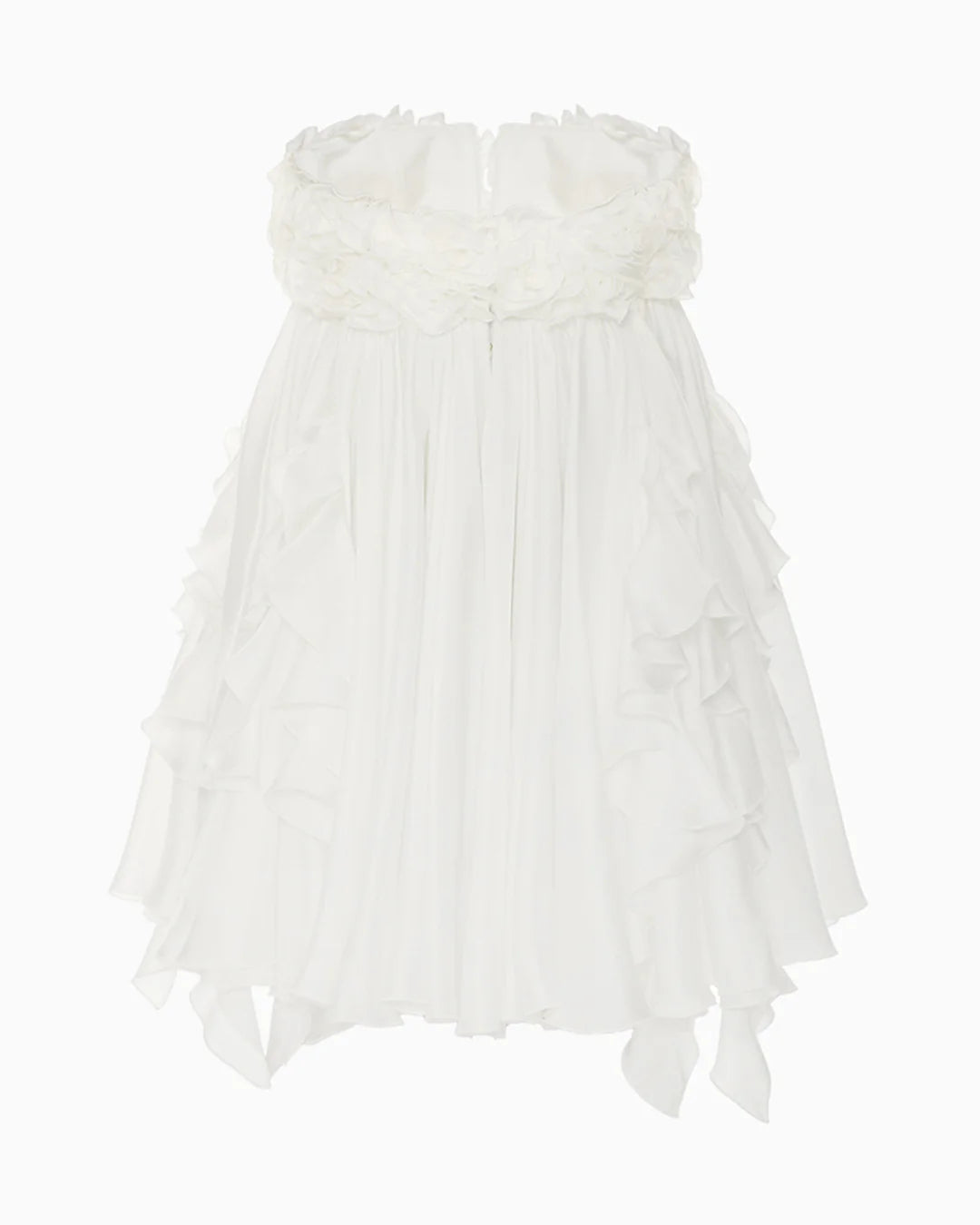 The fit and flare silhouette flows into airy, layered ruffles, creating light movement and a couture-inspired finish.