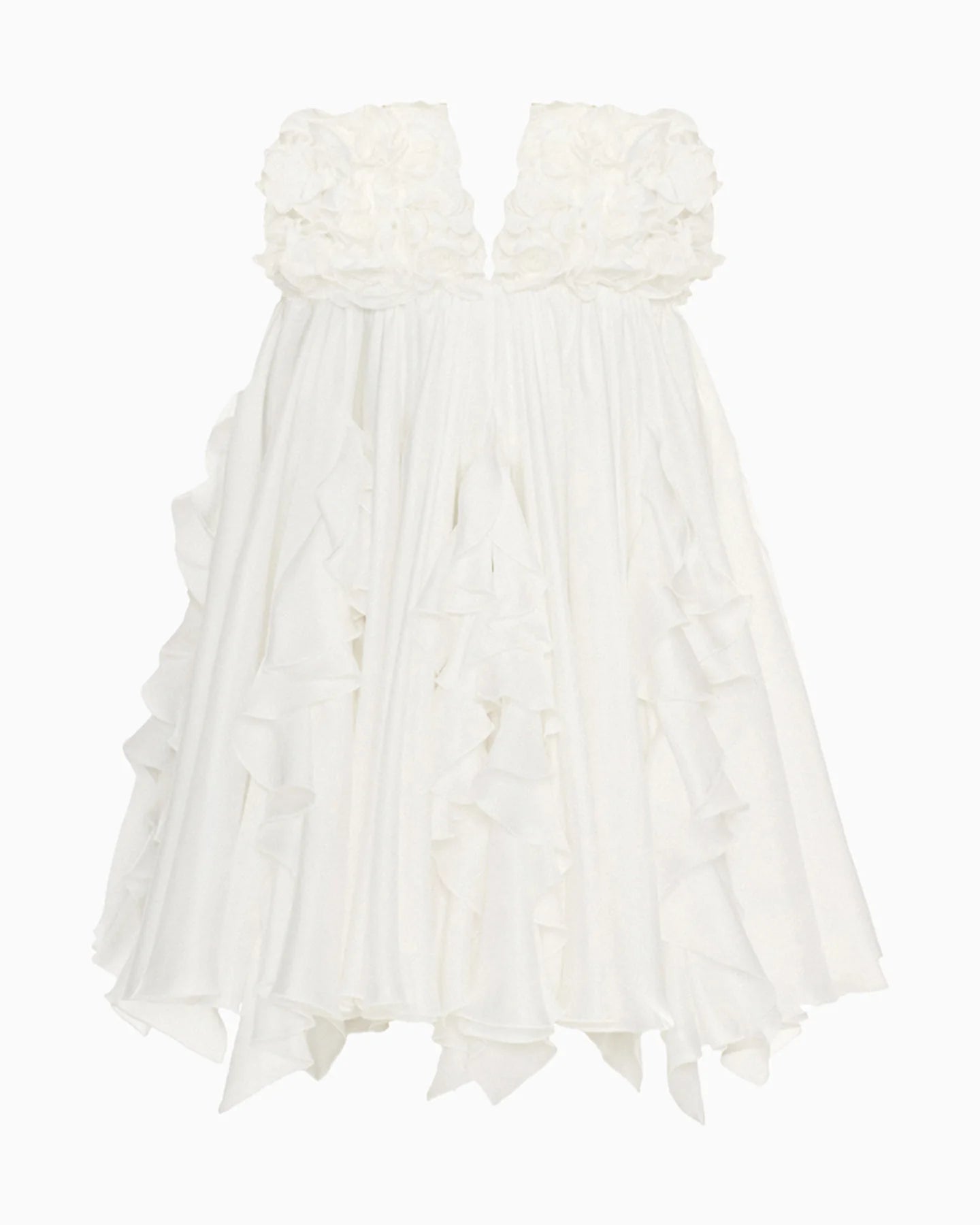 This strapless mini dress features a beautifully sculpted sweetheart neckline, highlighted with delicate 3D rosette floral appliqués that add texture and a dreamy, feminine charm to the bodice.