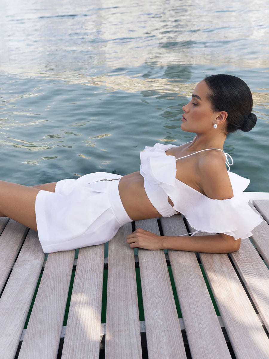 The Magnolia Ivoire Top is a delicate handmade piece inspired by the quiet elegance of white magnolia blossoms and fresh Ivoire in bloom.