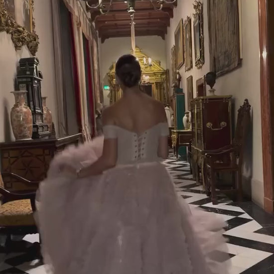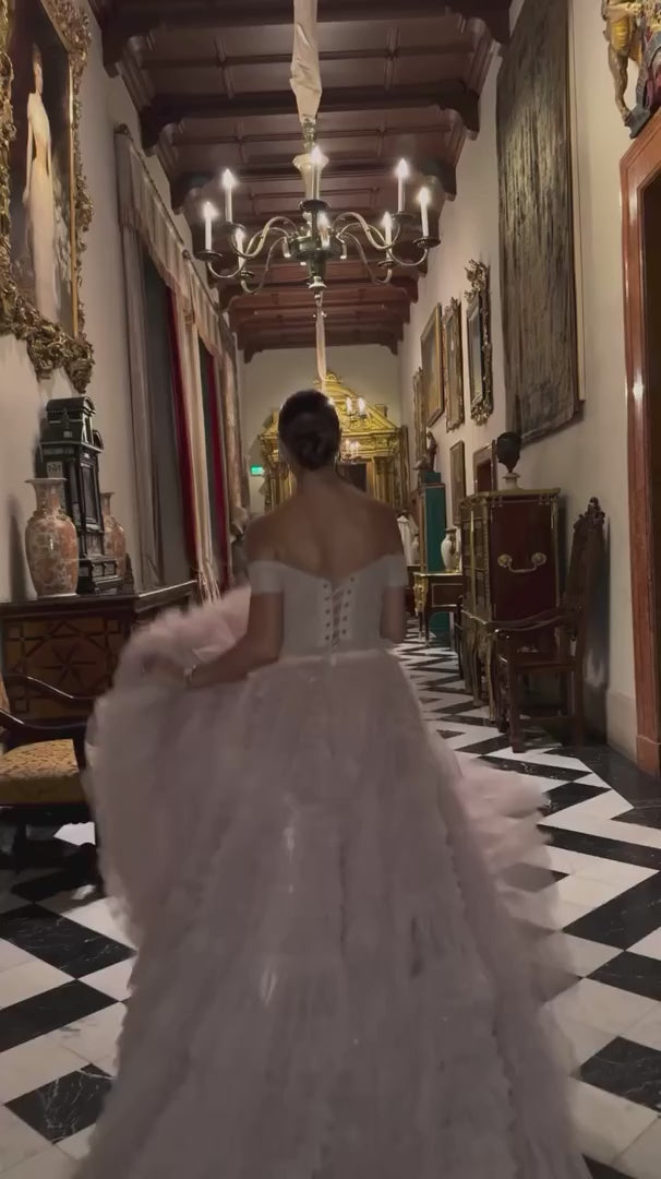 Designed to embody elegance and ethereal charm, this gown features a delicate off shoulder corset with a graceful Bardot neckline that beautifully frames the shoulders and collarbones.