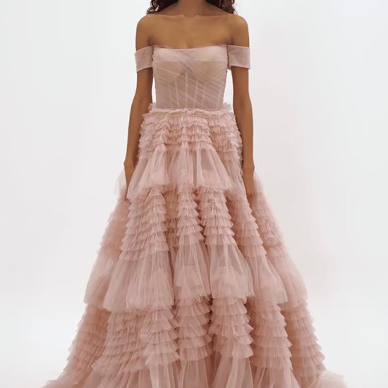 The Misty Roselle Off Shoulder Frill Layered Gown is a dreamy, princess style masterpiece crafted in soft misty rose tulle.
