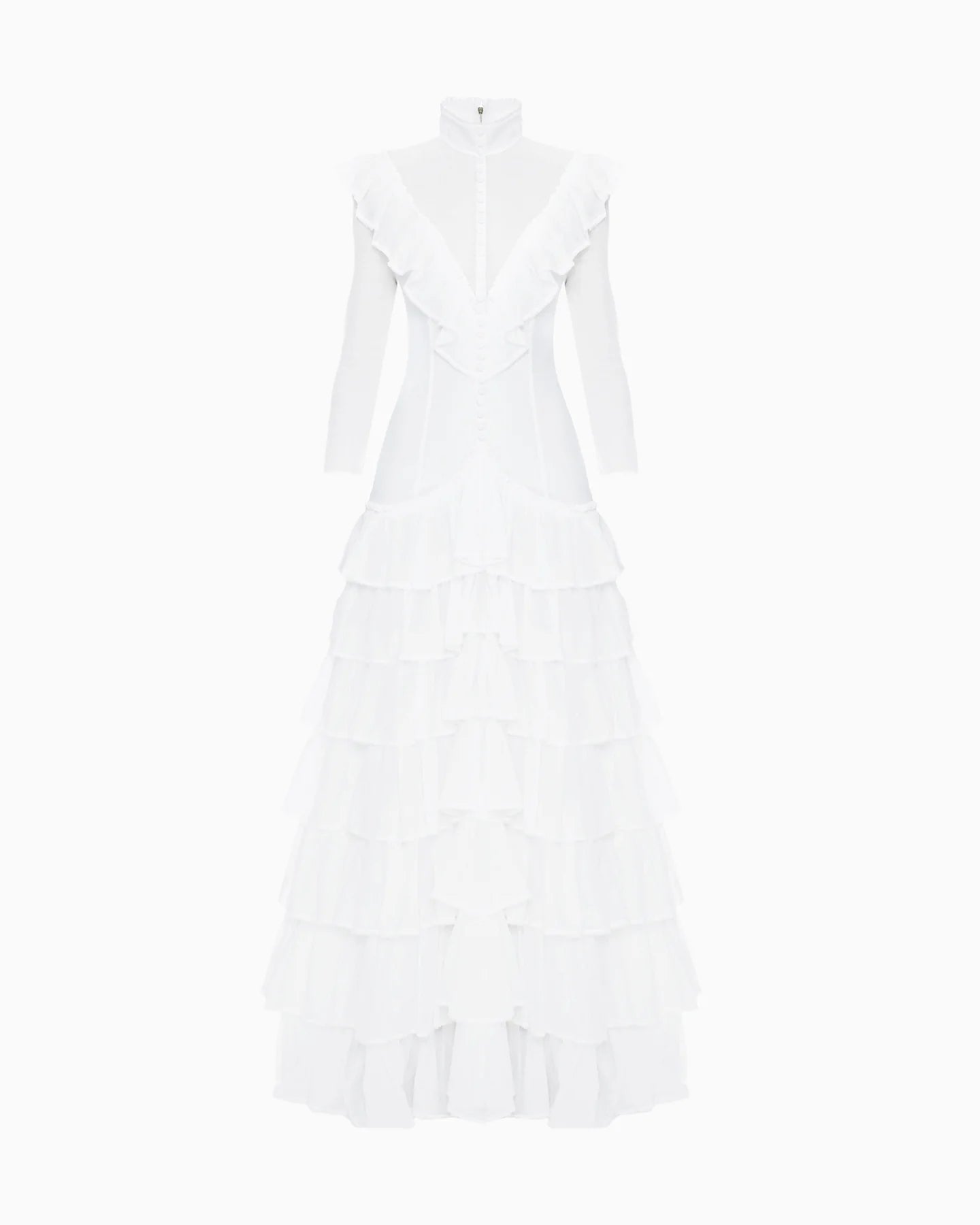 A voluminous ruffled skirt forms the heart of this gown, cascading in layers that create romantic fullness and a graceful, princess like silhouette.