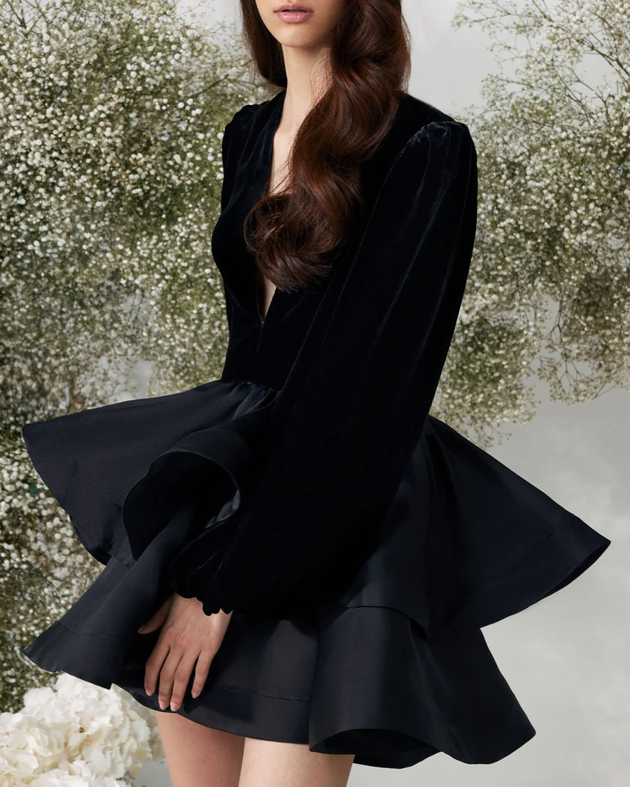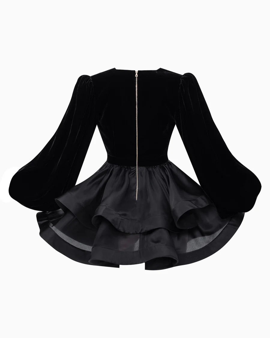 The bodice is made from rich natural velvet, offering a soft, sculpted fit. The skirt flows into layered silk organza, creating dreamy movement with every step.