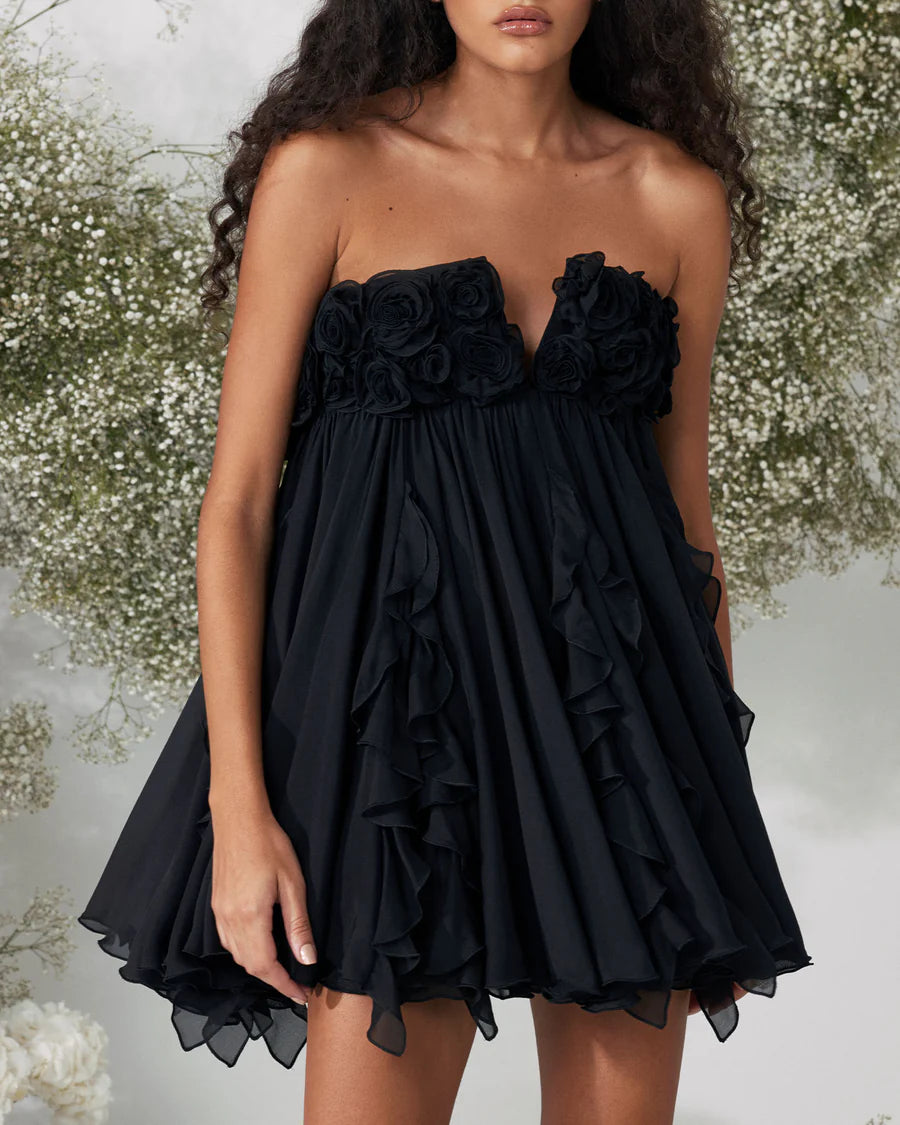This strapless mini dress features a sculpted sweetheart neckline, elevated with intricate 3D rosette floral appliqués that add depth, drama, and romantic allure to the bodice while enhancing the feminine silhouette.