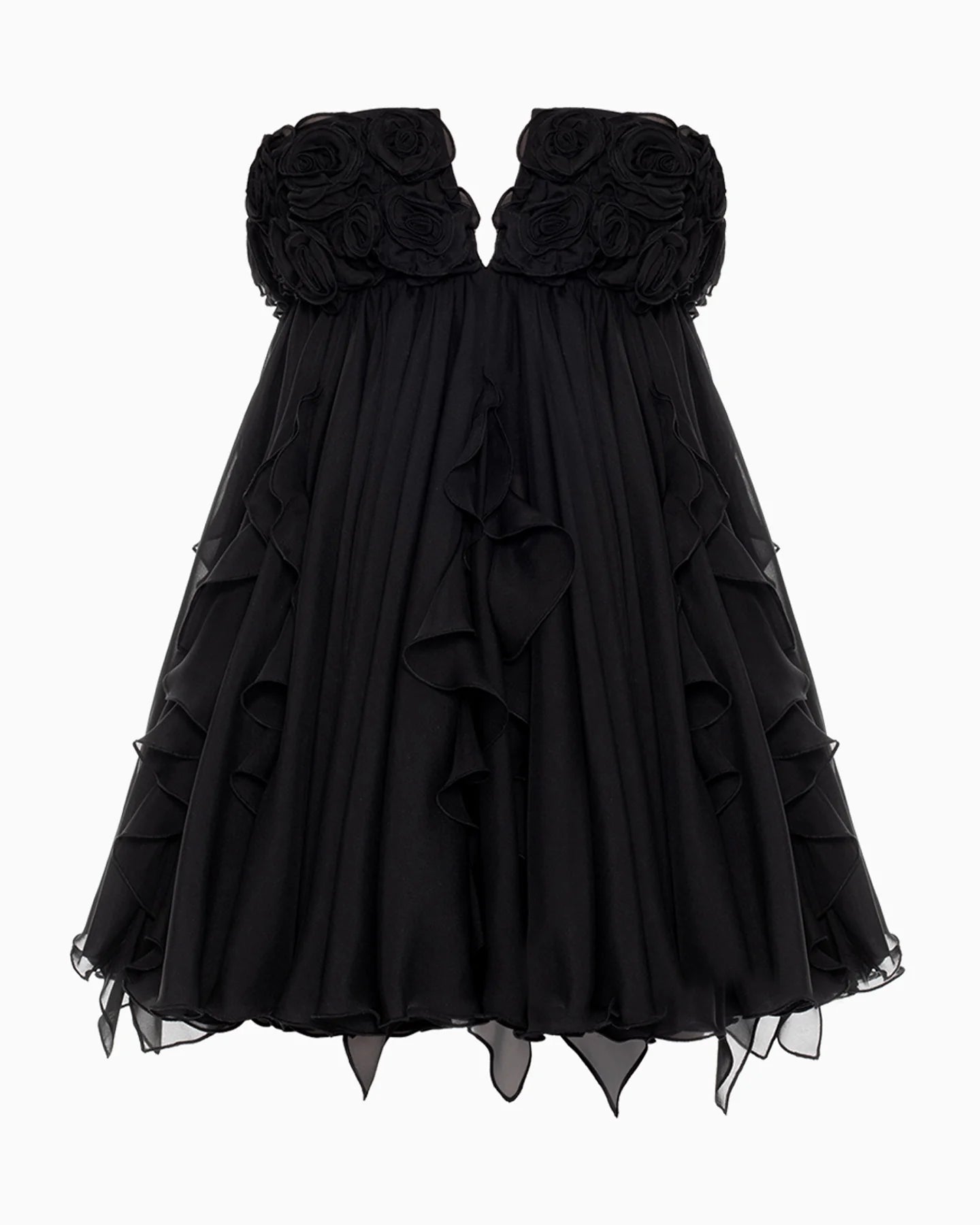 The flared mini skirt cascades into soft, airy ruffle layers, creating graceful movement with a couture inspired finish.