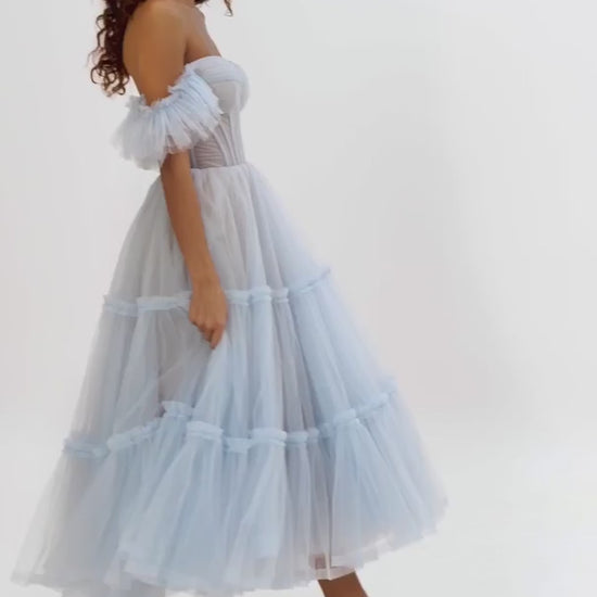 Soft Blue Ruffle Tulle Midi Dress