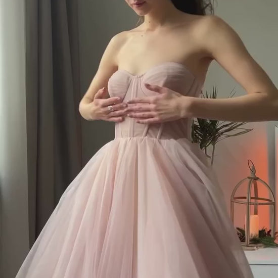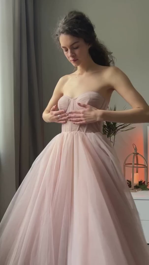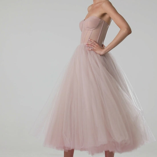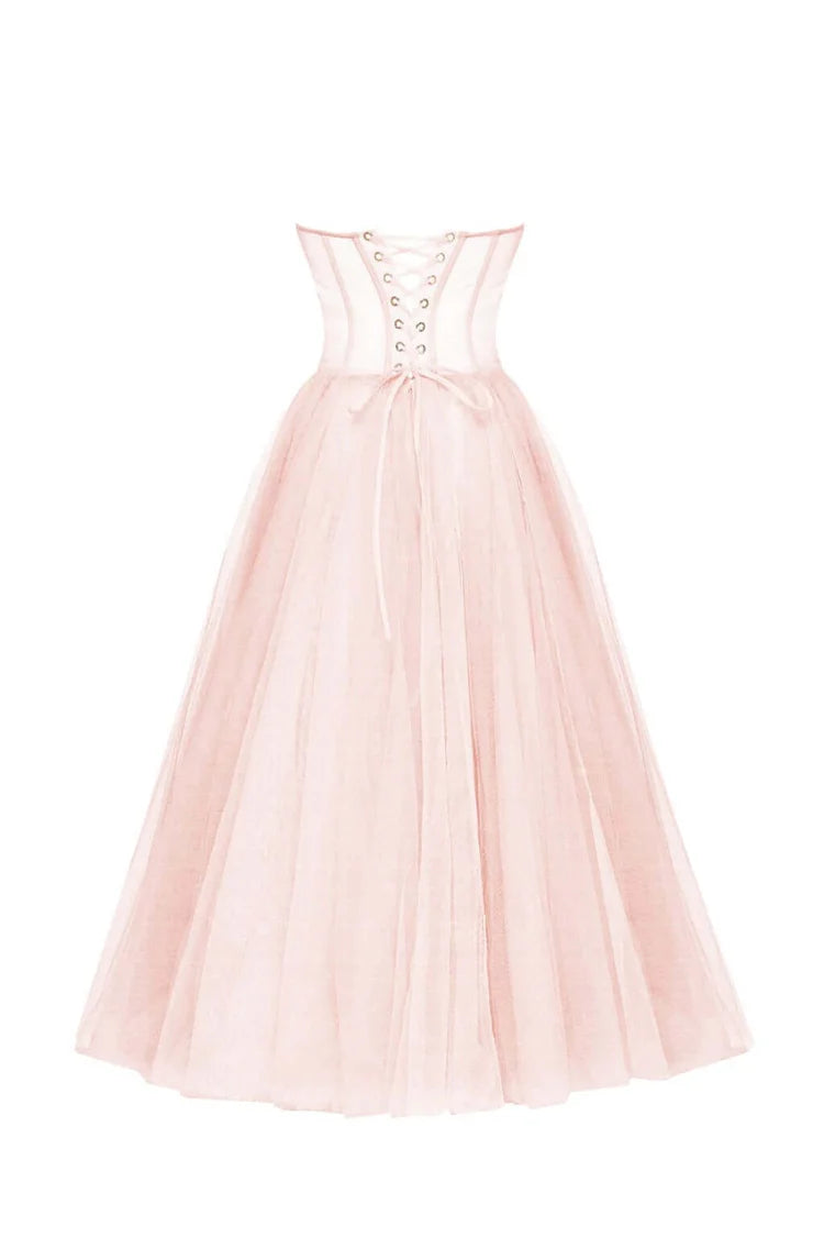Float into elegance with the Strapless Blush Bloom Midi Tulle Dress, crafted to capture soft, romantic charm in a dreamy blush hue. The semi transparent corset bustier shapes the waist beautifully, featuring a delicate heart shaped neckline that highlights the feminine silhouette.