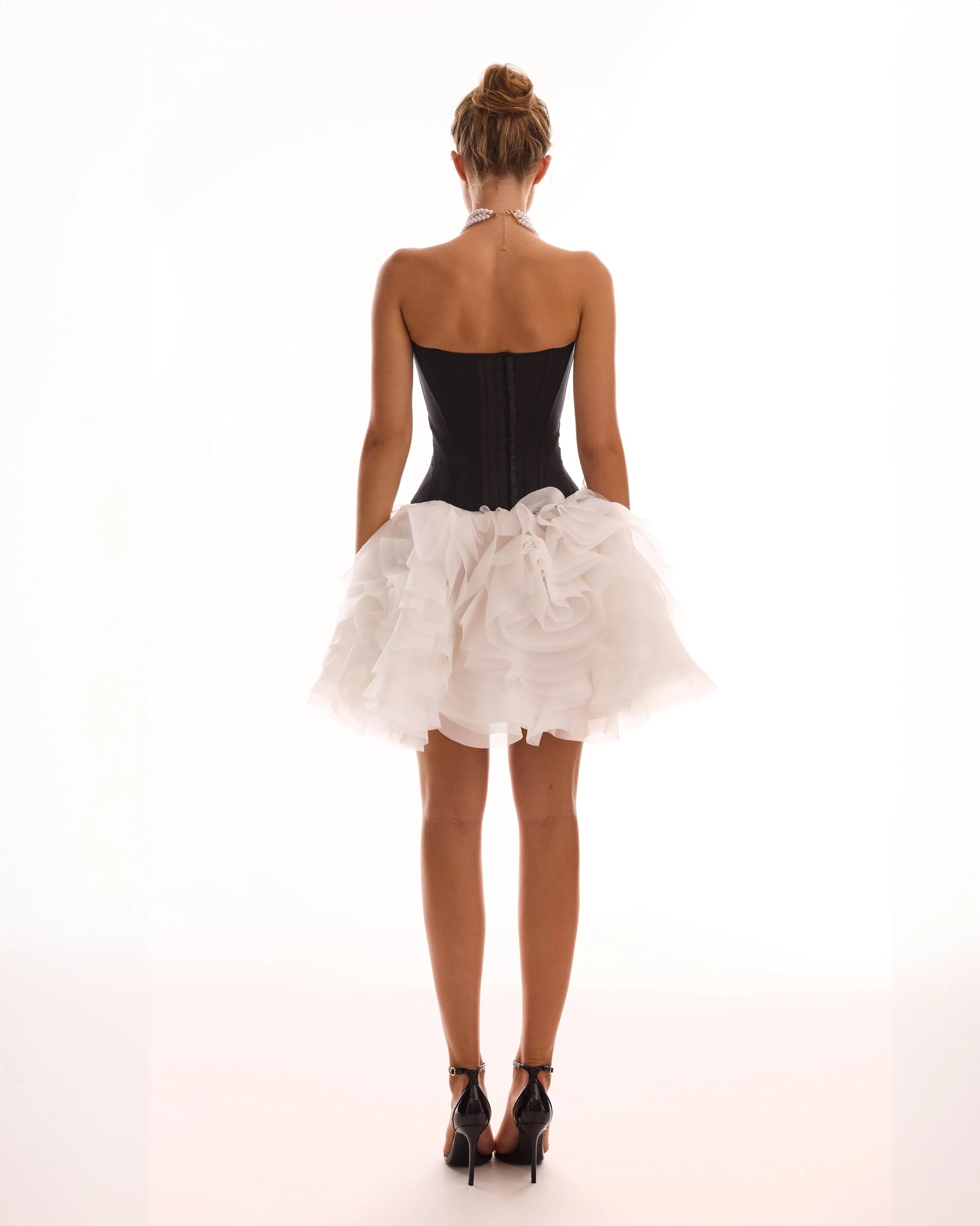 Search Keywords: prom outfit two piece, corset top and skirt set, cocktail party dress, ruffled tulle mini dress, black and pink formal set, strapless corset party outfit.