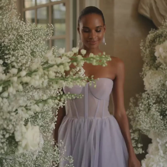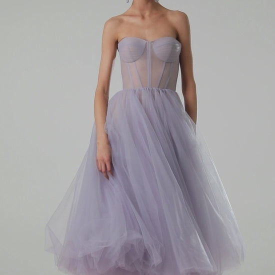 Float into elegance with the Strapless Lavender Bloom Midi Tulle Dress, crafted to capture soft, romantic charm. The semi transparent corset bustier shapes the waist beautifully, featuring a delicate heart shaped neckline that enhances the feminine silhouette.