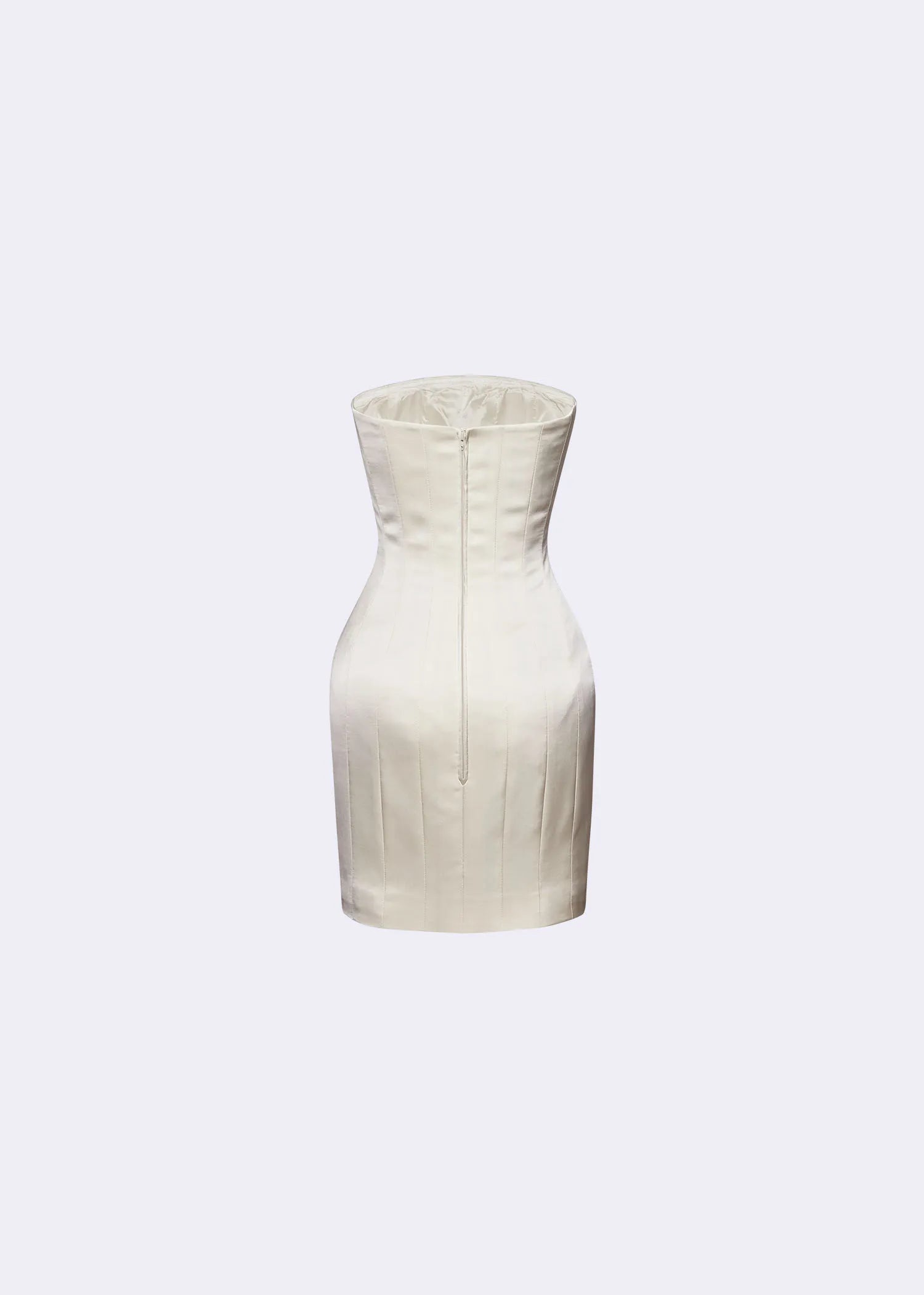 The Vanilla Muse Strapless Bodycon Fit. This cream mini dress is crafted to highlight your curves with refined sophistication and a sleek, sculpted silhouette.