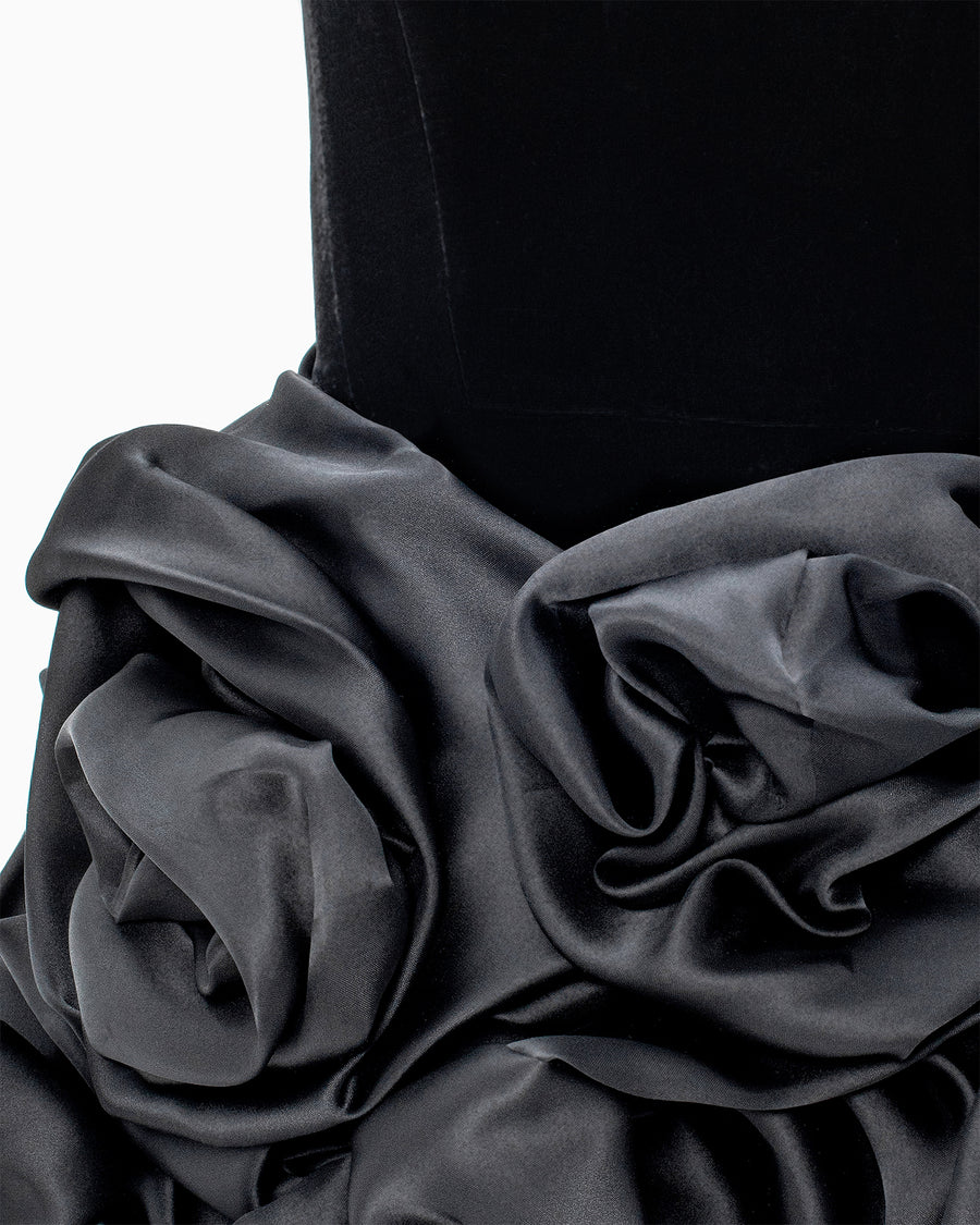 The hem is adorned with exquisite black rosebuds, each one carefully hand selected and placed through an extraordinary 56 hour artisanal process, transforming the dress into a true work of wearable art.